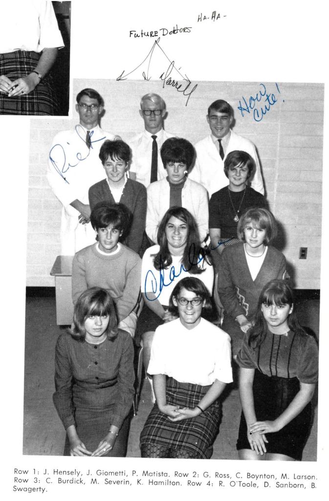 The day that club pictures were to be taken for the yearbook, just happened to be a day that I had a swim meet. On swim meet days, the team wore a tie, and I usually wore my letterman’s jacket. This particular swim meet was in another town, so we had passes to be out of school after lunch. As it turned out we didn’t have to leave until after 1:30, so we had some free time. The morning announcements included a schedule of where and when the club pictures were to be taken. My friends and I got the “great” idea to show up for these club pictures and see how many we could sneak into. The photographer began to get suspicious when I showed up for the Spanish Club photo just after getting my picture taken with the German Club. I actually was in the Spanish Club, but it was hard to get people to vouch for me, being as I didn’t really actually attend their meetings. Finally, the photographer had it with us when we showed up for the Nurse’s Club photo shoot. On our way to the Nurses’s Club classroom, we stopped across the hall at the Chemistry lab and donned white lab coats. The future nurses were overjoyed to have the attention, and the photographer made a deal with us to not bother him any more that day if he took our picture with them. We eagerly made that deal, being as we had to gather soon to attend our swim meet.