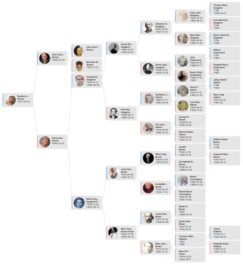 Bradford John Shreve’s Family Tree Back to Swagerty Family Trees Back to Family Trees Share this: Click to share on X (Opens in new window) X Click to share on Facebook (Opens in new window) Facebook Like Loading...