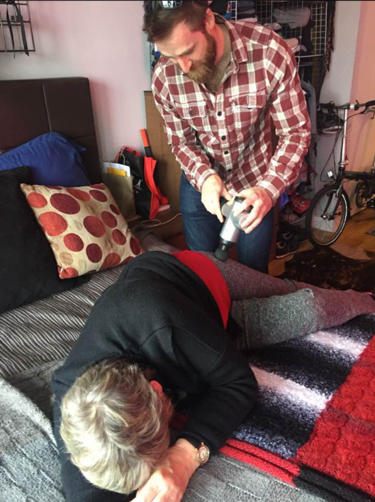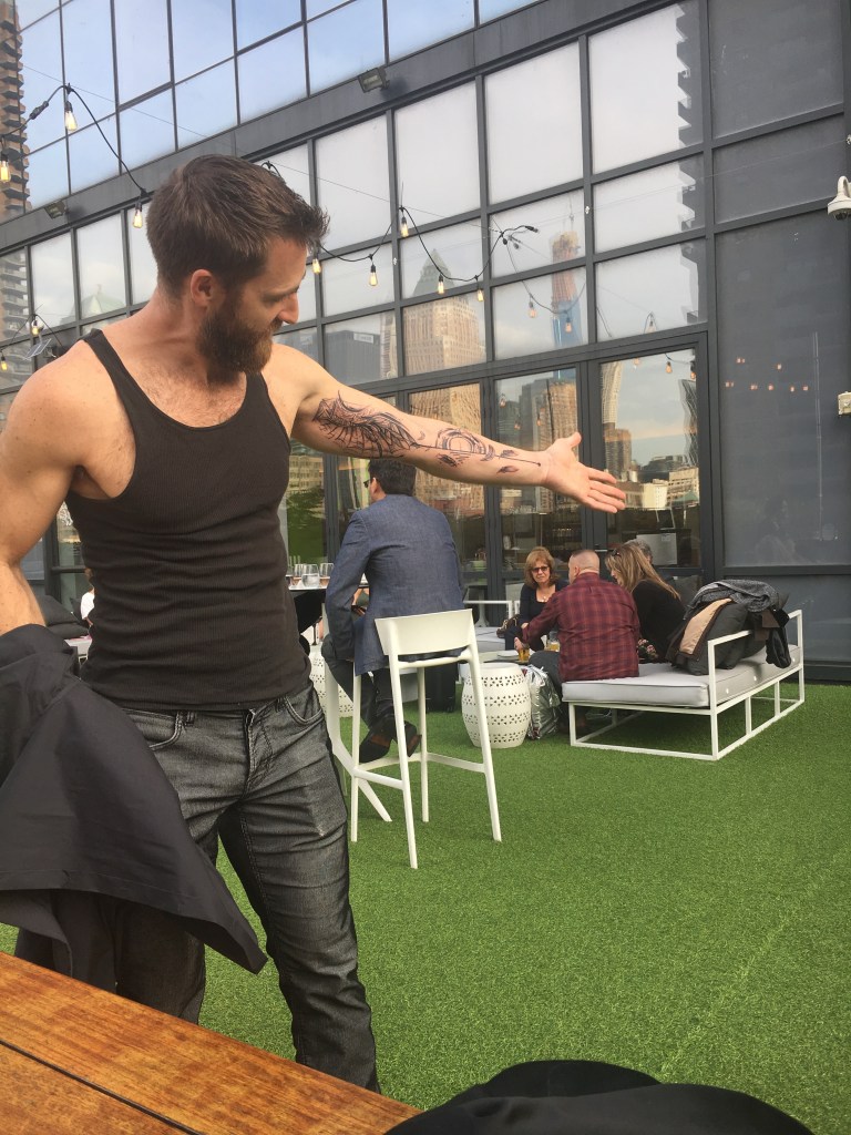 We traveled on all seven floors and looked at all of the available shopping opportunities. A great variety of eating opportunities were before us. As we headed back, Brad noticed I was not keeping up. I confessed that my knee hurt and he had the cure. We returned to his apartment and he used a massage device and broke down the knots in my hip that were affecting my knee. It was not pleasant but I did have to admit my knee felt better. Brad also warned me that while we were at our next show he would getting his first tattoo on the inside of his left arm. He had shopped around and this particular artist was from Paris and only in Manhattan for a short time. I took a picture of his arm before so I could contrast it with the after picture.