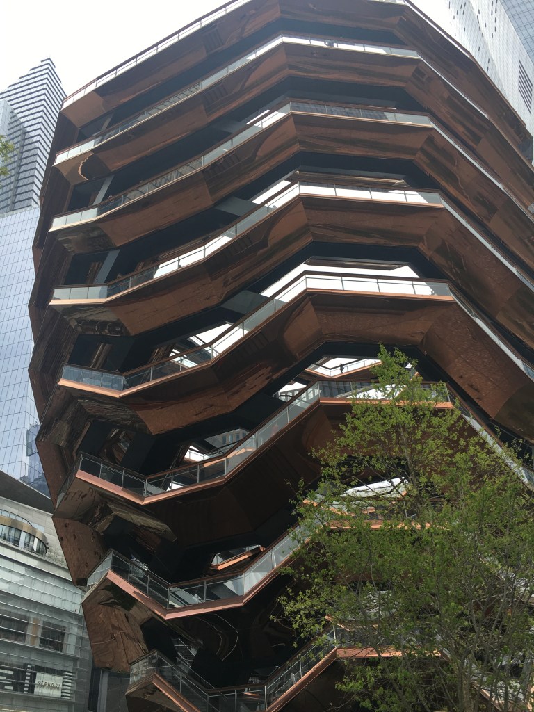 Thursday we both had breakfast at the Yotel. There were pastries, various drinks, fruits and yogurt. It was all we needed. We then headed to Brad’s apartment which was only three blocks away. Ginny got to see her first NYC studio apartment. Everything in his space has a place. He is on the 24th floor so he has a great view of the Hudson River. Brad then had us follow him to the newly redone neighborhood of Hudson Yards. There was the Vessel which we would conquer tomorrow. The Shed was another structure that has venues for large crowds. Then the center of Hudson Yards contained the massive shopping center full of high end shops.