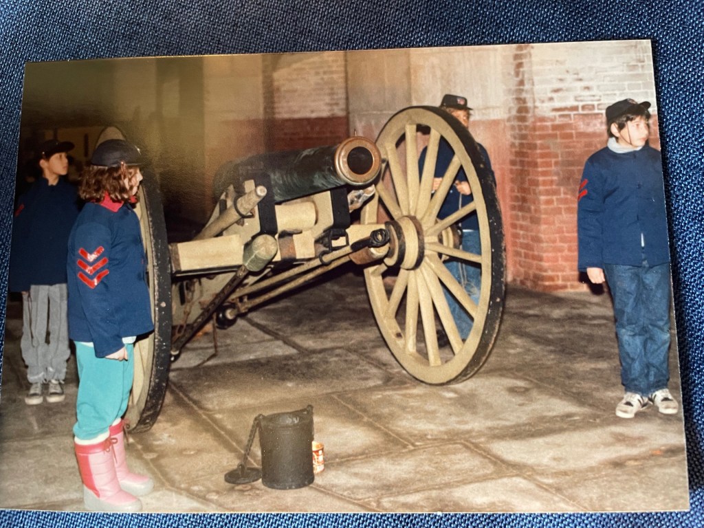 My son had some fun when he came back as a lieutenant. He started at 1:00 A.M. role playing “Jeb the Reb.” He would lurk around in various hiding places and come out of hiding to test the guards on guard duty. He shared with me how he had many soldiers quite on edge including himself. The 1:00 squad stayed up another hour to help the 2:00 duty squad find the intruder. Imagine 12 ten year olds canvassing the three tiers of Fort Point in darkness trying to find the enemy. Aaron, my oldest, was flattened against a wall waiting for someone to come near. He was rather on edge waiting for someone to find him. Coming down the corridor was a nervous soldier with his wooden musket raised ready for action. That soldier just happened to be Aaron’s younger brother Brad. Aaron was unable to give the pass word to a soldier who discovered him and he was taken prisoner. The other lieutenant Lisa Sipe was the officer consulted and she praised the soldiers and let the prisoner be released.