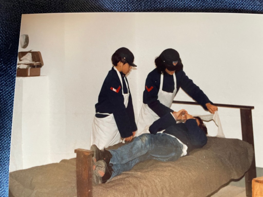 The medical squad learned the various procedures for certain injuries soldiers could incur during battle. We were equipped with many long strips of bandages, a stretcher and a crutch.