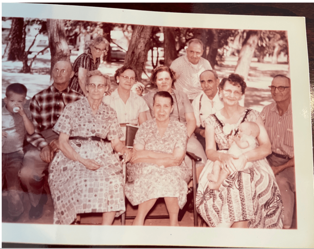 In the first photo Grant is on the far left with a cup up to his mouth. In the front row is Lucy Swagerty Morris, Stella Swagerty Repas, Helen Swagerty Hunter holding her grandchild. In the second row on the left next to Grant is Elmer Swagerty, Alice Swagerty Hutchinson, Iona Swagerty, daughter of Wilbur, Howard Morris husband of Lucy, Wilbur is on the far right. The back row is Pearl Aldrich Swagerty, wife of Elmer, John Swagerty.