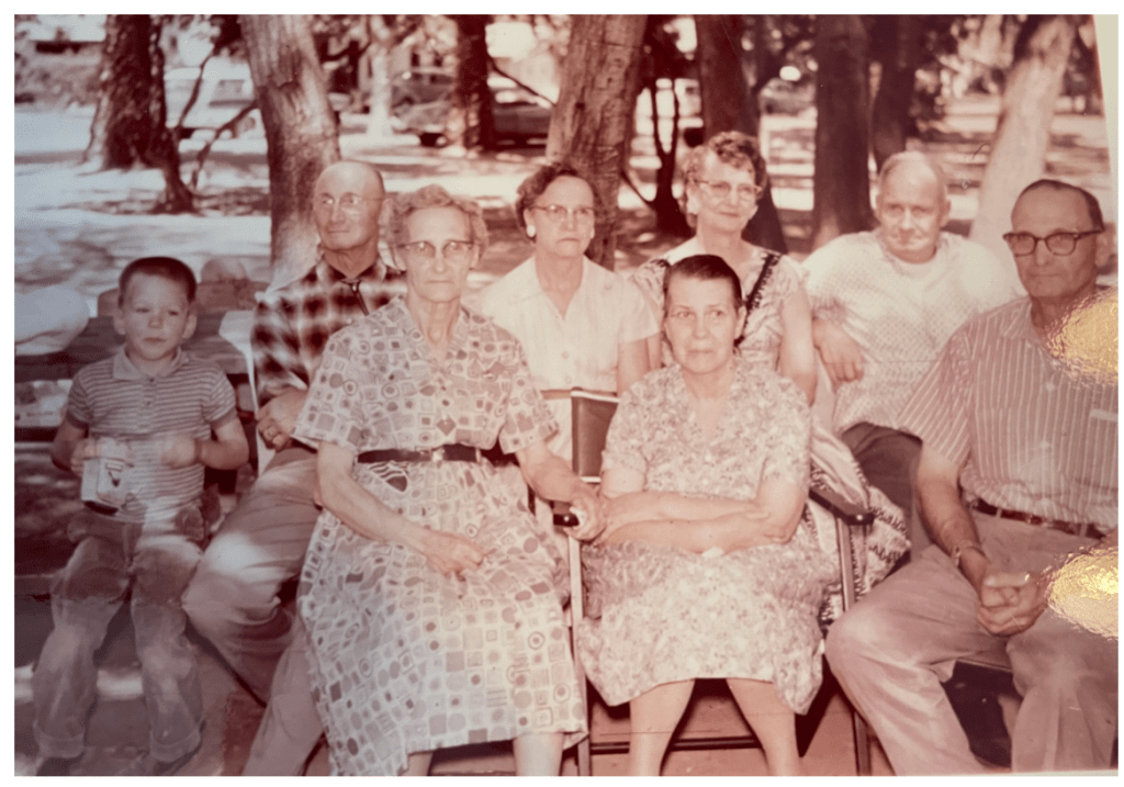 Lois Ann was able to offer that Swagerty reunions usually took place in public parks and most likely this reunion was in Modesto as it was a convenient meeting place for all involved. Based on the look of Grant who was born in 1954, he looked about 4 or 5. The others in the picture are the seven surviving Swagerty siblings of Sampson C. Swagerty and Emma Underwood. The oldest daughter Belle had died in 1953 and the oldest son Harley had died in 1947. The next sibling to die was Alice and she died in 1961. Based on this information, the photo was probably taken in 1958 or 1959. After consulting with my siblings, we wondered why Grant was there with his grandparents but not with any other sibling or parent. What makes us ask this question is the presence of Grant in the picture with the seven Swagerty siblings. He is definitely not part of that group. Yet he sits there and our grandfather Elmer seems to have no reason to have Grant be out of the picture. Elmer has what I consider a proud look to have one of his 16 grandchildren sitting next to him.