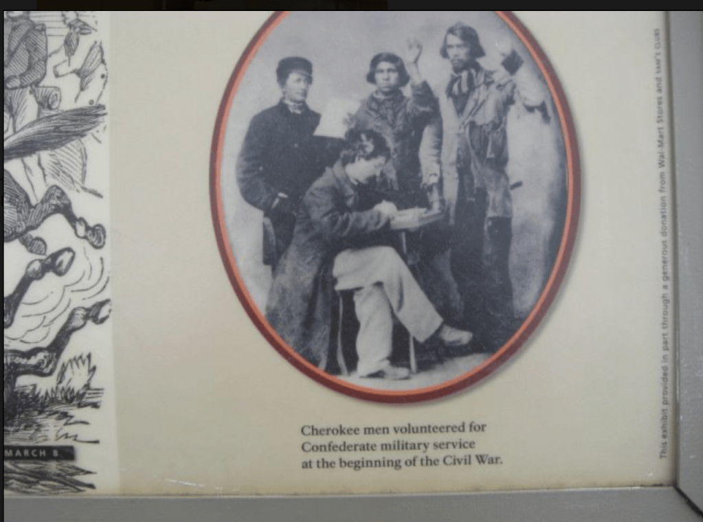 This is recognition that Cherokee Indians became soldiers for the Confederates. When the Union started firing their canons, the Indians disappeared into the woods. Maybe some of my Indians were fighting against the Federals.