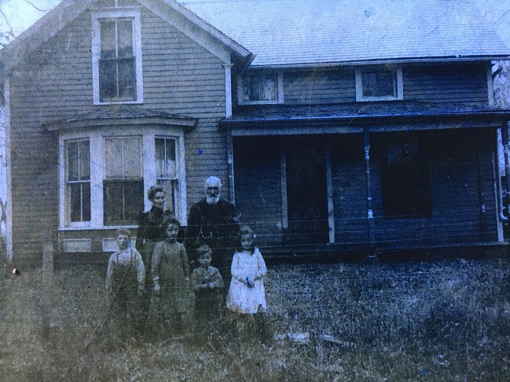 I took another look at the photo of Great Grandmother Ida standing in front of their home in Iowa. Now for the first time there was a picture of Cousin Joe and Great Great Grandpa George Palmer. Ida’s father who took turns living at each of his three daughters’ homes when he retired.. George’s house job was to keep Ida supplied with a fresh bucket of water from the well. Great Aunt Lucy confessed to begging Cousin Joe to bring in the kindling for the kitchen fire as Lucy hated the dark and the wood pile and her job was to bring in the kindling. Based on the year 1906, Ida is 27 years old, George would be 62, Pearl was 5, Clarence was 3, Lulu was 7. Joe looks close to Lulu or Pearl’s age.